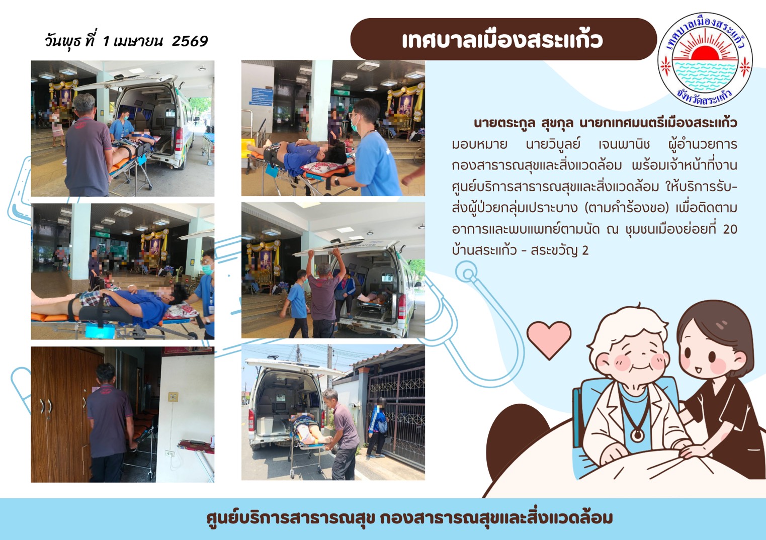 (1 เม.ย. 69) นายตระกูล สุขกุล นายกเทศมนตรีเมืองสระแก้ว มอบหมายนายวิบูลย์ เจนพานิช ผู้อำนวยการกองสาธารณสุขและสิ่งแวดล้อม พร้อมเจ้าหน้าที่งานศูนย์บริการสาธารณสุขและสิ่งแวดล้อม ให้บริการรับ-ส่งผู้ป่วยกลุ่มเปราะบาง (ตามคำร้องขอ) เพื่อติดตามอาการและพบแพทย์ตามนัด ณ ชุมชนเมืองย่อยที่ 20 (บ้านสระแก้ว - สระขวัญ 2)