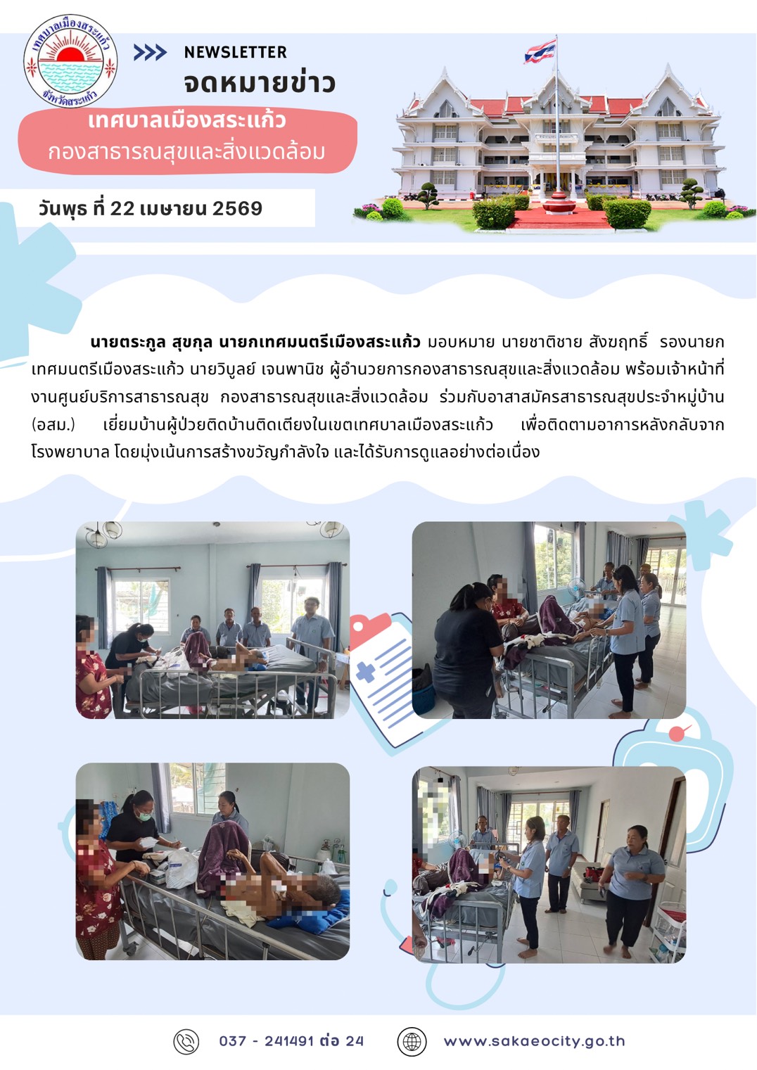 (22 เม.ย. 69) นายตระกูล สุขกุล นายกเทศมนตรีเมืองสระแก้ว มอบหมายนายชาติชาย สังฆฤทธิ์ รองนายกเทศมนตรีเมืองสระแก้ว นายวิบูลย์ เจนพานิช ผู้อำนวยการกองสาธารณสุขและสิ่งแวดล้อม พร้อมเจ้าหน้าที่งานศูนย์บริการสาธารณสุข กองสาธารณสุขและสิ่งแวดล้อม ร่วมกับอาสาสมัครสาธารณสุขประจำหมู่บ้าน (อสม.) เยี่ยมบ้านผู้ป่วยติดบ้านติดเตียงในเขตเทศบาลเมืองสระแก้ว เพื่อติดตามอาการหลังกลับจากโรงพยาบาล โดยมุ่งเน้นการสร้างขวัญกำลังใจ และได้รับการดูแลอย่างต่อเนื่อง