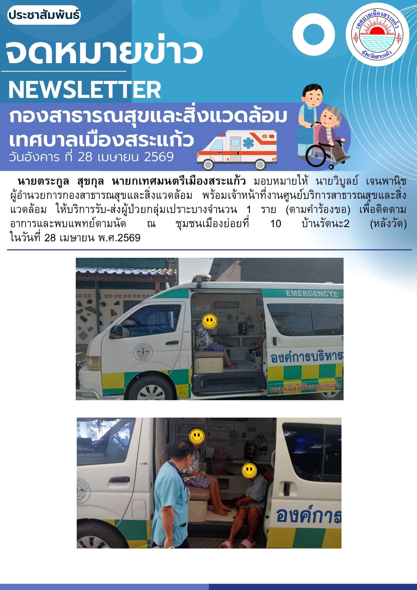(28 เม.ย. 69) นายตระกูล สุขกุล นายกเทศมนตรีเมืองสระแก้ว มอบหมายให้นายวิบูลย์ เจนพานิช ผู้อำนวยการกองสาธารณสุขและสิ่งแวดล้อม พร้อมเจ้าหน้าที่งานศูนย์บริการสาธารณสุขและสิ่งแวดล้อม ให้บริการรับ-ส่งผู้ป่วยกลุ่มเปราะบาง จำนวน 1 ราย (ตามคำร้องขอ) เพื่อติดตามอาการและพบแพทย์ตามนัด ณ ชุมชนเมืองย่อยที่ 10 บ้านเนินรัตนะ2 (หลังวัดสระแก้ว)
