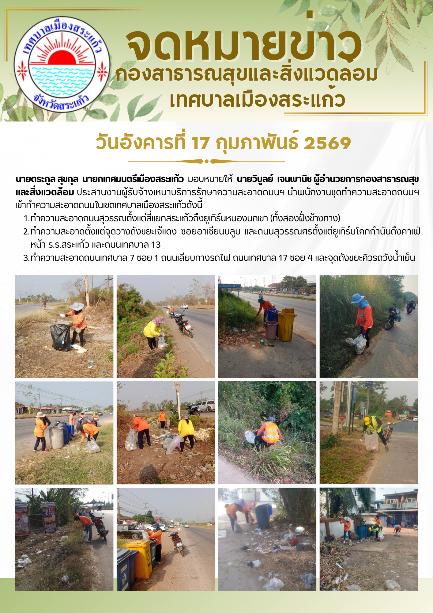 เทศบาลเมืองสระแก้ว ดำเนินการทำความสะอาดถนน