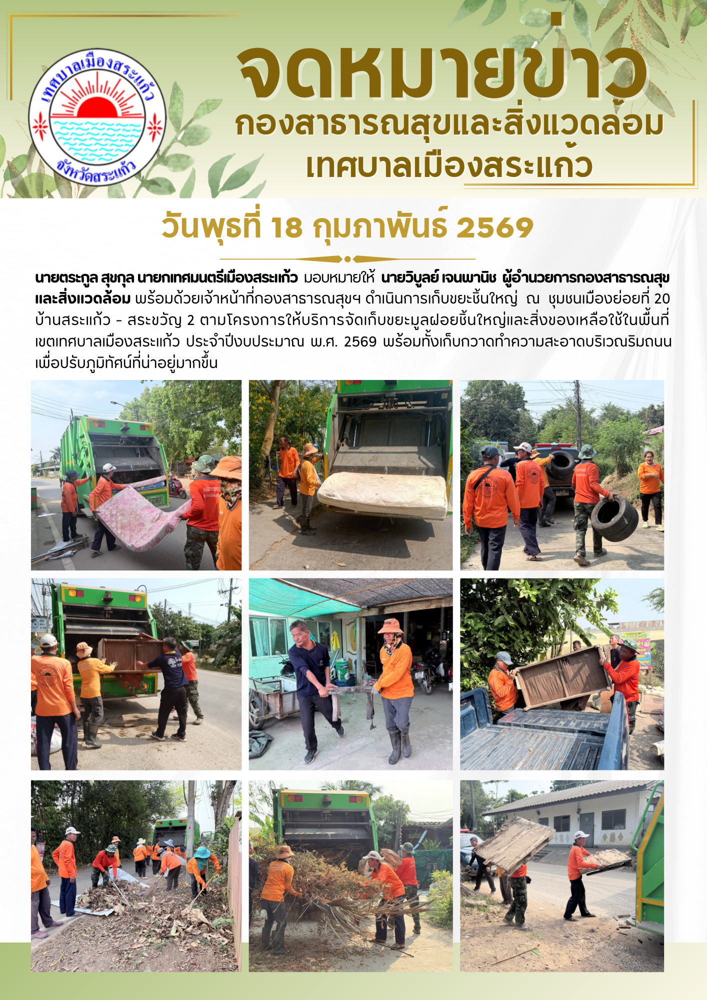 เทศบาลเมืองสระแก้ว ดำเนินการเก็บขยะชิ้นใหญ่