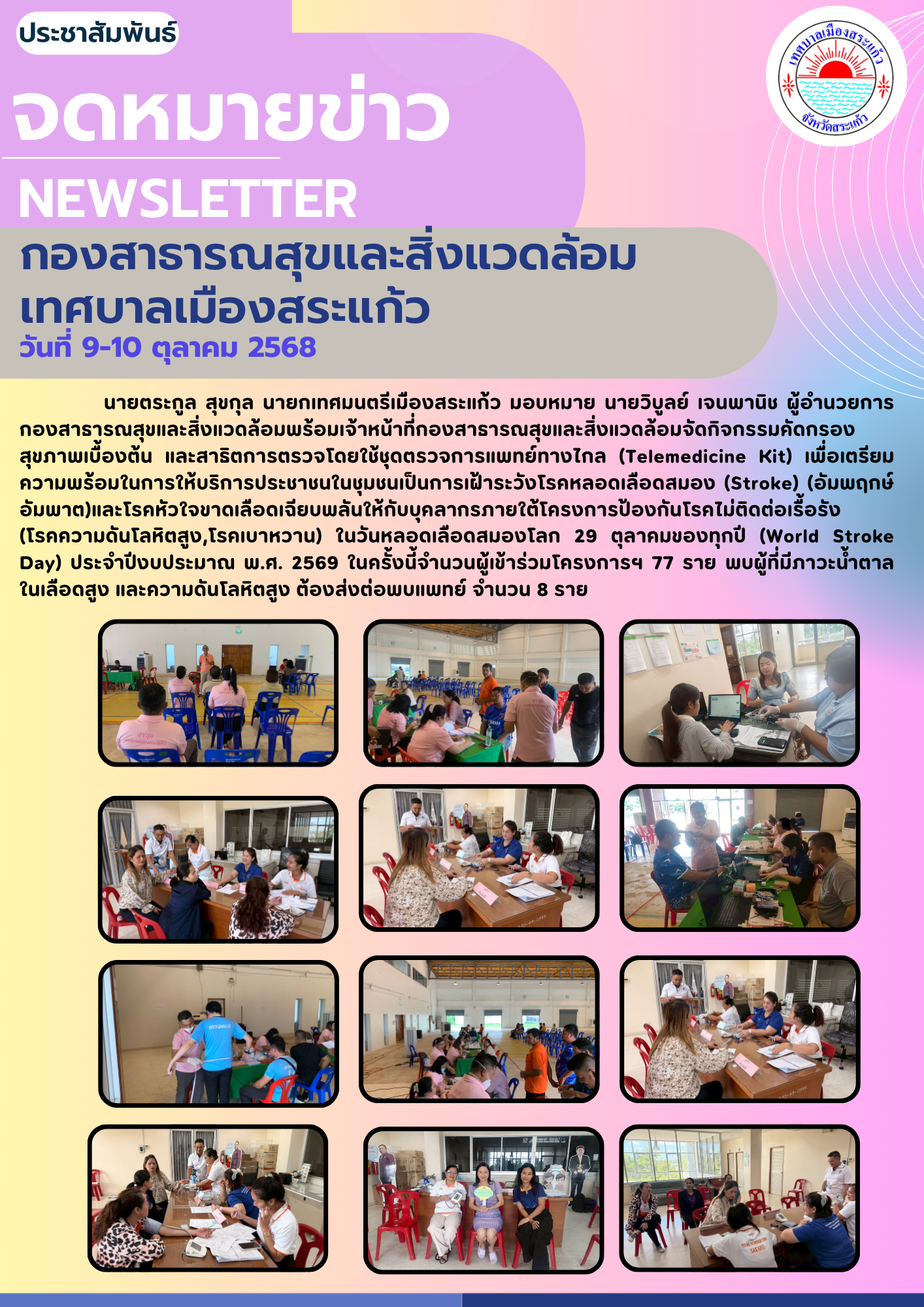 ในวันที่ 9 - 10 ตุลาคม 2568 นายตระกูล สุขกุล นายกเทศมนตรีเมืองสระแก้ว มอบหมายนายวิบูลย์ เจนพานิช ผู้อำนวยการกองสาธารณสุขและสิ่งแวดล้อม พร้อมเจ้าหน้าที่กองสาธารณสุขและสิ่งแวดล้อม จัดกิจกรรมคัดกรองสุขภาพเบื้องต้น และสาธิตการตรวจโดยใช้ชุดตรวจการแพทย์ทางไกล (Telemedicine Kit) เพื่อเตรียมความพร้อมในการให้บริการประชาชน ในชุมชนเป็นการเฝ้าระวังโรคหลอดเลือดสมอง (Stroke) (อัมพฤกษ์ อัมพาต) และโรคหัวใจขาดเลือดเฉียบพลันให้กับบุคลากร ภายใต้โครงการป้องกันโรคไม่ติดต่อเรื้อรัง (โรคความดันโลหิตสูง โรคเบาหวาน) ในวันหลอดเลือดสมองโลก 29 ตุลาคมของทุกปี (World Stroke Day) ประจำปีงบประมาณ พ.ศ. 2569 ในครั้งนี้จำนวนผู้เข้าร่วมโครงการฯ 77 ราย พบผู้ที่มีภาวะน้ำตาล ในเลือดสูง พบผู้ที่มีภาวะน้ำตาลในเลือดสูง และความดันโลหิตสูง ต้องส่งต่อพบแพทย์ จำนวน 8 ราย