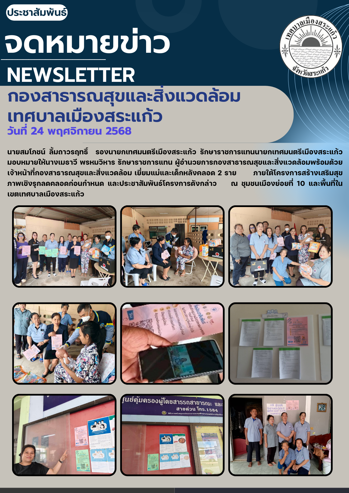 (24 พ.ย. 68) นายสมโภชน์ ลิ้มถาวรฤทธิ์ รองนายกเทศมนตรีเมืองสระแก้ว รักษาราชการแทน นายกเทศมนตรีเมืองสระแก้ว มอบหมายให้นางเมธาวี พรหมวิหาร รักษาราชการแทน ผู้อำนวยการกองสาธารณสุขและสิ่งแวดล้อม พร้อมด้วยเจ้าหน้าที่กองสาธารณสุขและสิ่งแวดล้อม ลงพื้นที่เยี่ยมแม่และเด็กหลังคลอด 2 ราย ภายใต้โครงการสร้างเสริมสุขภาพเชิงรุกลดคลอดก่อนกำหนด และประชาสัมพันธ์โครงการดังกล่าว ณ ชุมชนเมืองย่อยที่ 10 บ้านเนินรัตนะ 2 (หลังวัดสระแก้ว) และพื้นที่ในเขตเทศบาลเมืองสระแก้ว