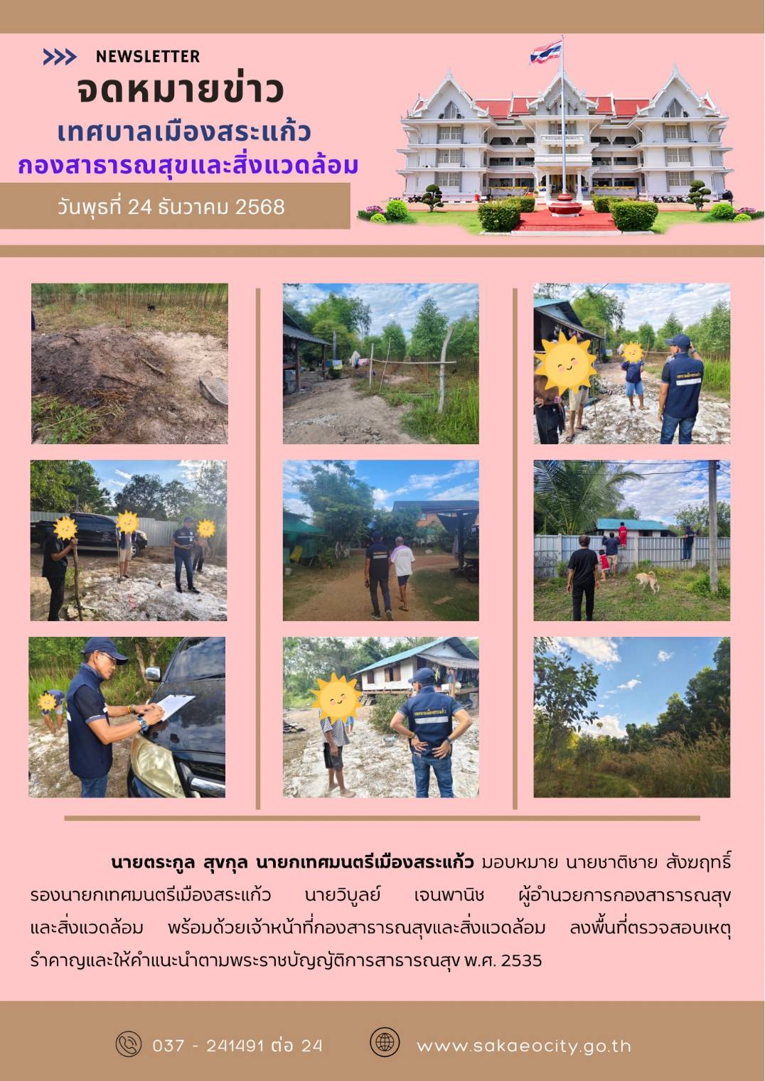 (24 ธ.ค. 68) นายตระกูล สุขกุล นายกเทศมนตรีเมืองสระแก้ว มอบหมายนายชาติชาย สังฆฤทธิ์ รองนายกเทศมนตรีเมืองสระแก้ว นายวิบูลย์ เจนพานิช ผู้อำนวยการกองสาธารณสุขและสิ่งแวดล้อม พร้อมด้วยเจ้าหน้าที่กองสาธารณสุขและสิ่งแวดล้อม ลงพื้นที่ตรวจสอบเหตุรำคาญและให้คำแนะนำตามพระราชบัญญัติการสาธารณสุข พ.ศ. 2535