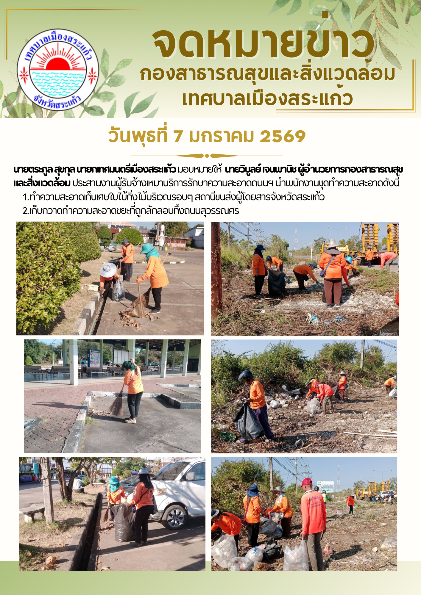 (7 ม.ค. 69) นายตระกูล สุขกุล นายกเทศมนตรีเมืองสระแก้ว มอบหมายให้นายวิบูลย์ เจนพานิช ผู้อำนวยการกองสาธารณสุขและสิ่งแวดล้อม ประสานงานผู้รับจ้างเหมาบริการรักษาความสะอาดถนนฯ นำพนักงานชุดทำความสะอาด ดังนี้