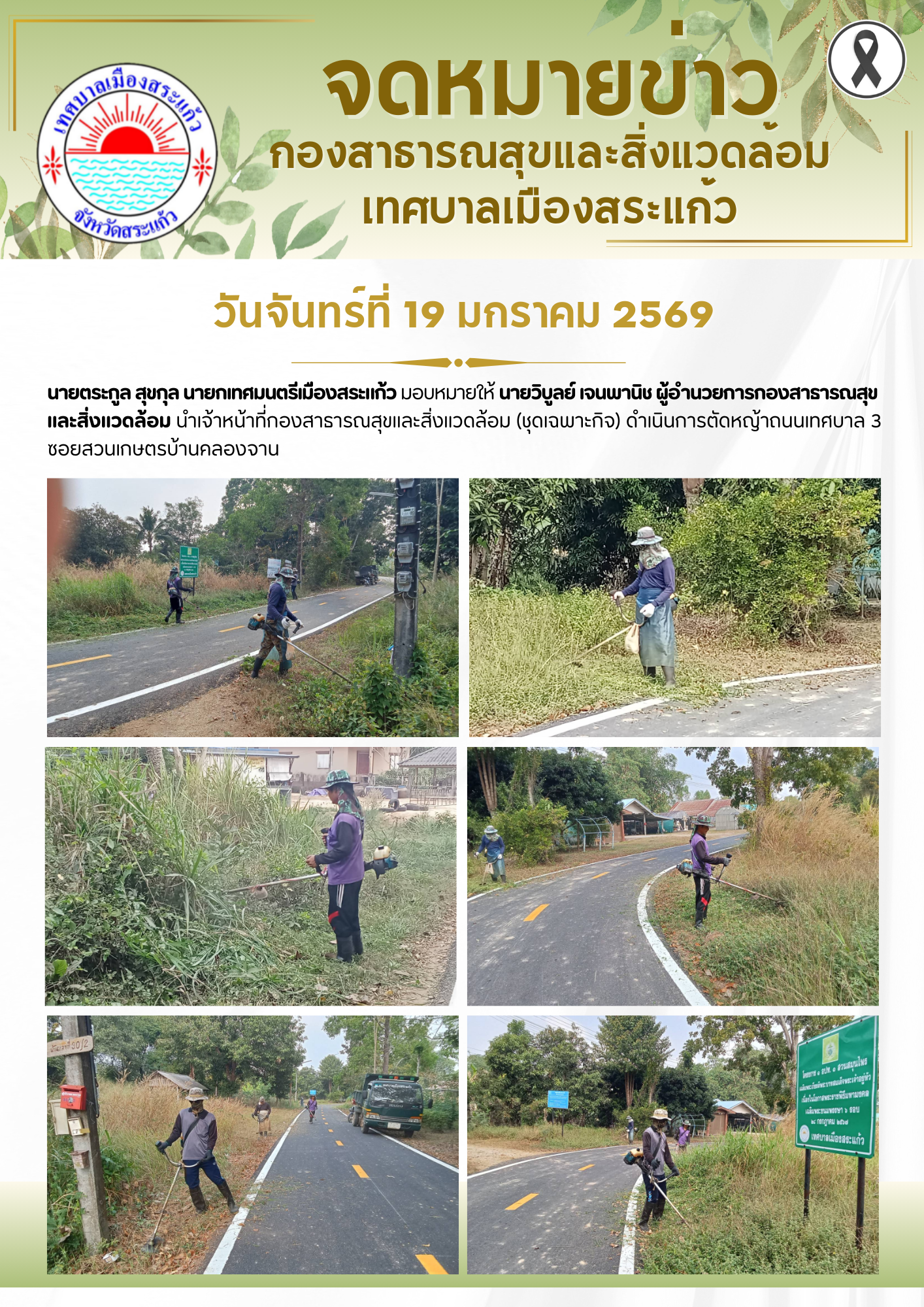(19 ม.ค. 69) นายตระกูล สุขกุล นายกเทศมนตรีเมืองสระแก้ว มอบหมายให้นายวิบูลย์ เจนพานิช ผู้อำนวยการกองสาธารณสุขและสิ่งแวดล้อม นำเจ้าหน้าที่กองสาธารณสุขและสิ่งแวดล้อม (ชุดเฉพาะกิจ) ดำเนินการตัดหญ้าถนนเทศบาล 3 ซอยสวนเกษตรบ้านคลองจาน