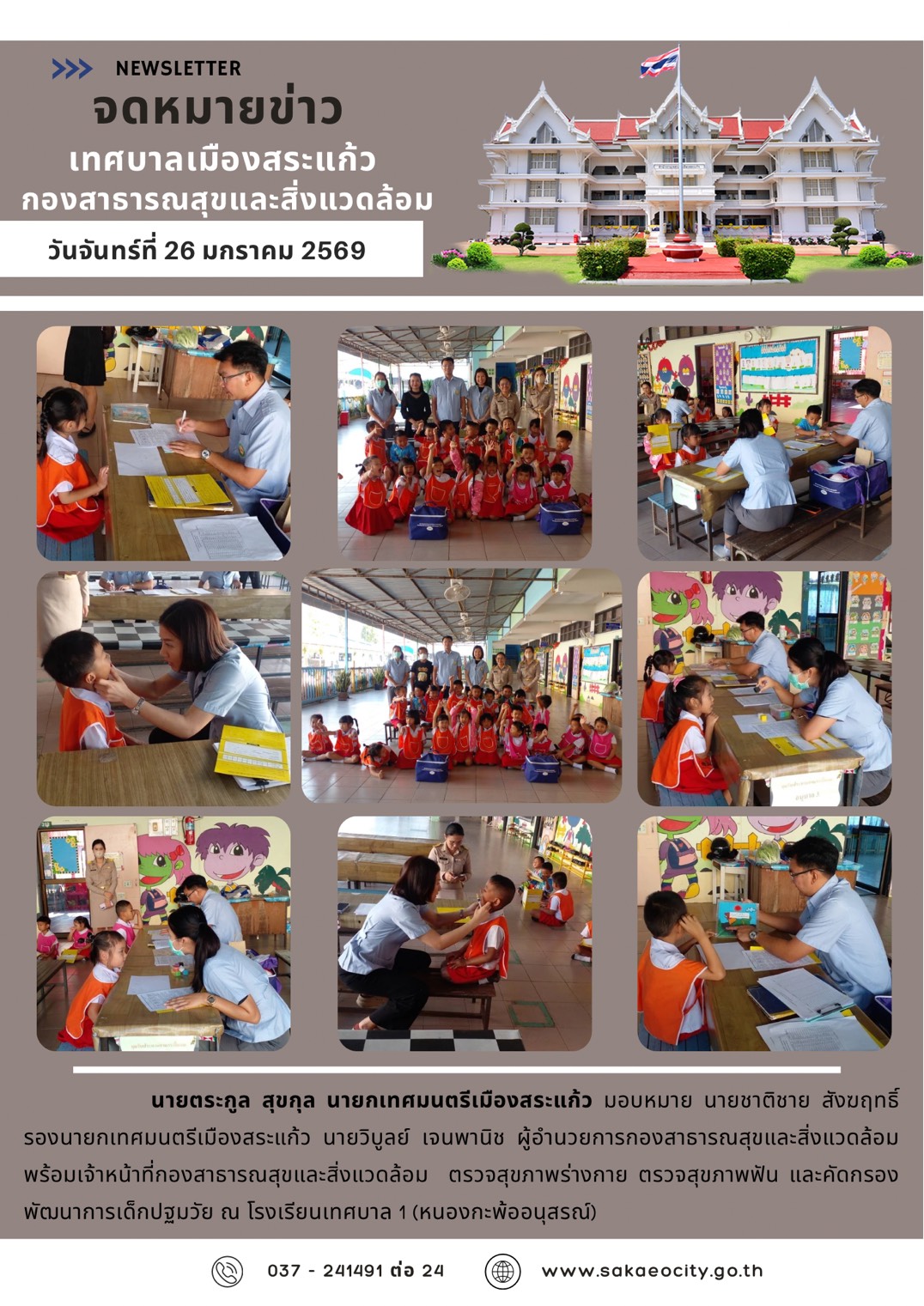 (26 ม.ค. 69) นายตระกูล สุขกุล นายกเทศมนตรีเมืองสระแก้ว มอบหมายนายชาติชาย สังฆฤทธิ์ รองนายกเทศมนตรีเมืองสระแก้ว นายวิบูลย์ เจนพานิช ผู้อำนวยการกองสาธารณสุขและสิ่งแวดล้อม พร้อมเจ้าหน้าที่กองสาธารณสุขและสิ่งแวดล้อม ลงพื้นที่ตรวจสุขภาพร่างกาย ตรวจสุขภาพฟัน และคัดกรองพัฒนาการเด็กปฐมวัย ณ โรงเรียนเทศบาล 1 (หนองกะพ้ออนุสรณ์)