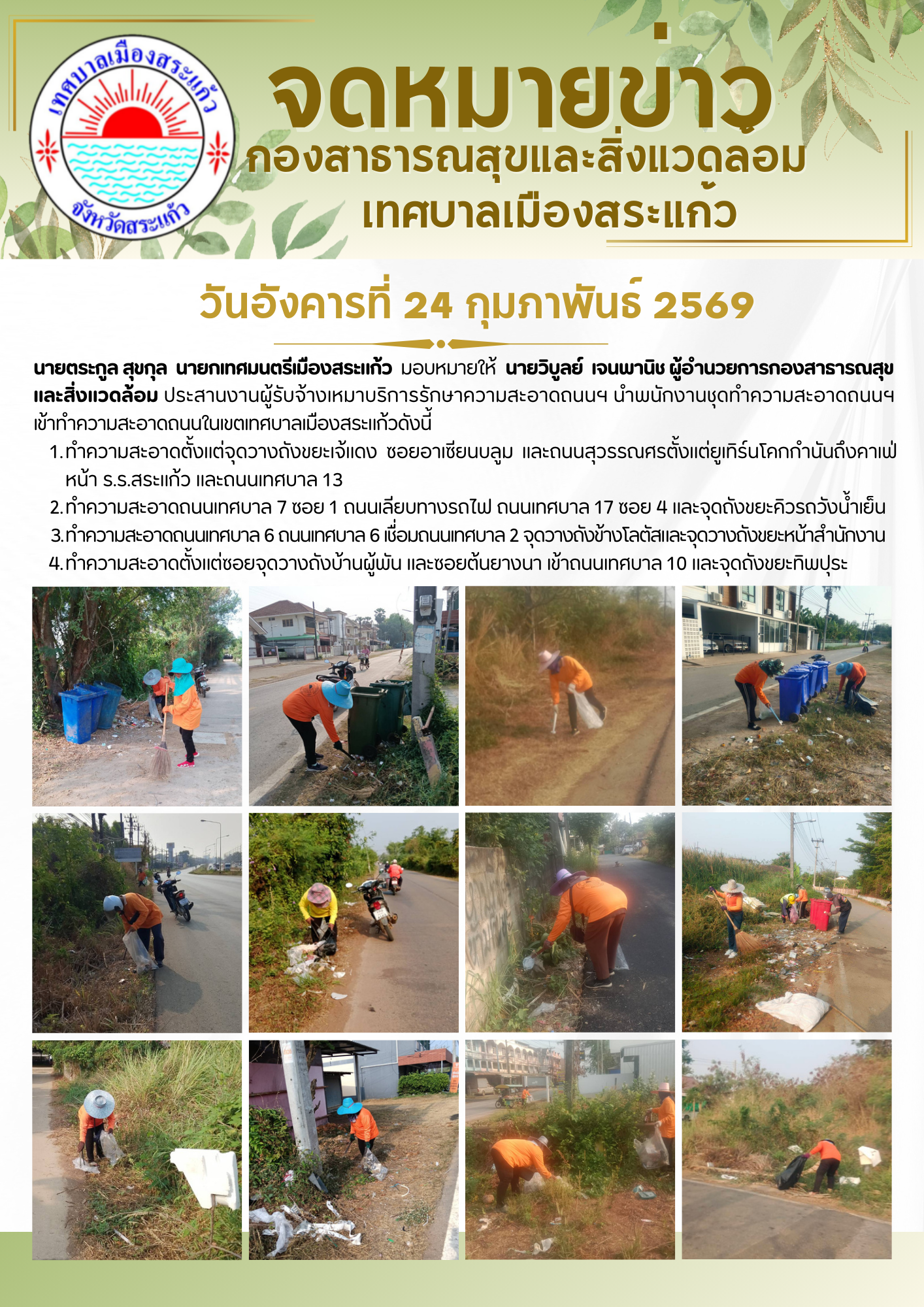 (24 ก.พ. 69) นายตระกูล สุขกุล นายกเทศมนตรีเมืองสระแก้ว มอบหมายให้นายวิบูลย์ เจนพานิช ผู้อำนวยการกองสาธารณสุขและสิ่งแวดล้อม ประสานงานผู้รับจ้างเหมาบริการรักษาความสะอาดถนนฯ นำพนักงานชุดทำความสะอาดถนนฯ เข้าทำความสะอาดถนนในเขตเทศบาลเมืองสระแก้วดังนี้