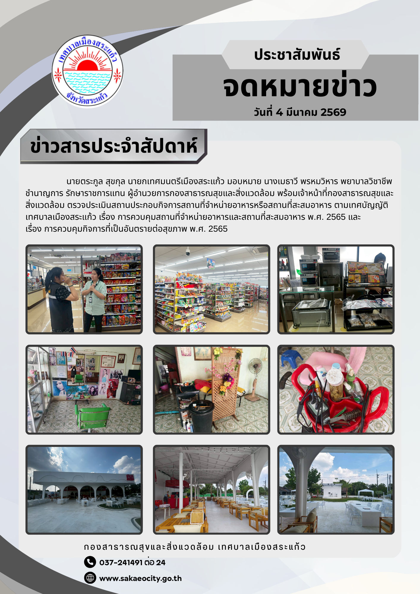 (4 มี.ค. 69) นายตระกูล สุขกุล นายกเทศมนตรีเมืองสระแก้ว มอบหมายนางเมธาวี พรหมวิหาร พยาบาลวิชาชีพชำนาญการ รักษาราชการแทน ผู้อำนวยการกองสาธารณสุขและสิ่งแวดล้อม พร้อมเจ้าหน้าที่กองสาธารณสุขและสิ่งแวดล้อม ลงพื้นที่ตรวจประเมินสถานประกอบกิจการสถานที่จำหน่ายอาหารหรือสถานที่สะสมอาหาร ตามเทศบัญญัติเทศบาลเมืองสระแก้ว เรื่อง การควบคุมสถานที่จำหน่ายอาหารและสถานที่สะสมอาหาร พ.ศ. 2565 และเรื่อง การควบคุมกิจการที่เป็นอันตรายต่อสุขภาพ พ.ศ. 2565