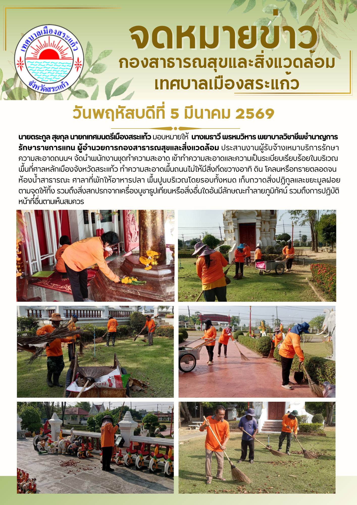 (5 มี.ค. 69) นายตระกูล สุขกุล นายกเทศมนตรีเมืองสระแก้ว มอบหมายให้นางเมธาวี พรหมวิหาร พยาบาลวิชาชีพชำนาญการ