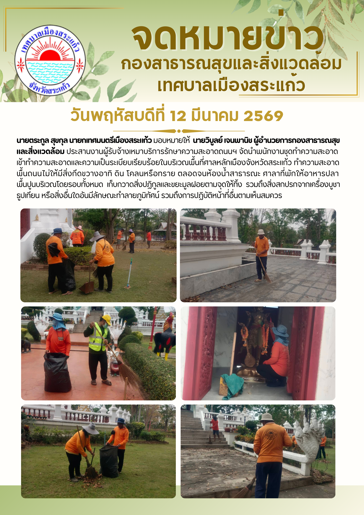 (12 มี.ค. 69) นายตระกูล สุขกุล นายกเทศมนตรีเมืองสระแก้ว มอบหมายให้นายวิบูลย์ เจนพานิช ผู้อำนวยการกองสาธารณสุขและสิ่งแวดล้อม ประสานงานผู้รับจ้างเหมาบริการรักษาความสะอาดถนนฯ จัดนำพนักงานชุดทำความสะอาด เข้าทำความสะอาดและความเป็นระเบียบเรียบร้อยในบริเวณพื้นที่ศาลหลักเมืองจังหวัดสระแก้ว ทำความสะอาดพื้นถนนไม่ให้มีสิ่งกีดขวางอาทิ ดิน โคลนหรือทราย ตลอดจนห้องน้ำสาธารณะ ศาลาที่พักให้อาหารปลาพื้นปูนบริเวณโดยรอบทั้งหมด เก็บกวาดสิ่งปฏิกูลและขยะมูลฝอยตามจุดให้ทิ้ง รวมถึงสิ่งสกปรกจากเครื่องบูชาธูปเทียนหรือสิ่งอื่นใดอันมีลักษณะทำลายภูมิทัศน์ รวมถึงการปฏิบัติหน้าที่อื่นตามเห็นสมควร