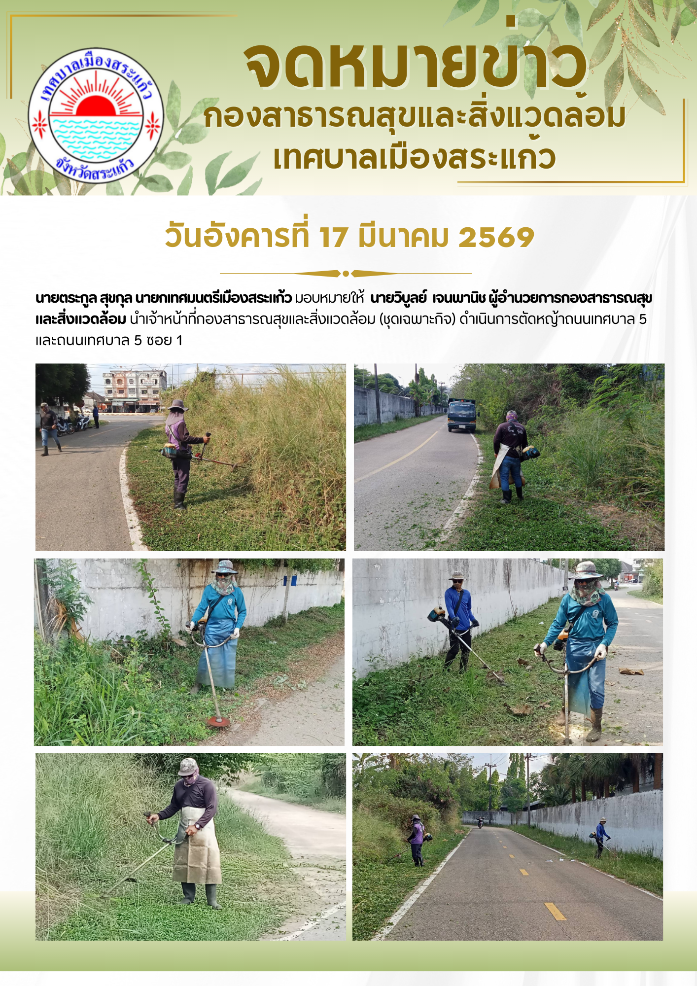 (17 มี.ค. 69) นายตระกูล สุขกุล นายกเทศมนตรีเมืองสระแก้ว มอบหมายให้นายวิบูลย์ เจนพานิช ผู้อำนวยการกองสาธารณสุขและสิ่งแวดล้อม นำเจ้าหน้าที่กองสาธารณสุขและสิ่งแวดล้อม (ชุดเฉพาะกิจ) ดำเนินการตัดหญ้าถนนเทศบาล 5 และถนนเทศบาล 5 ซอย 1