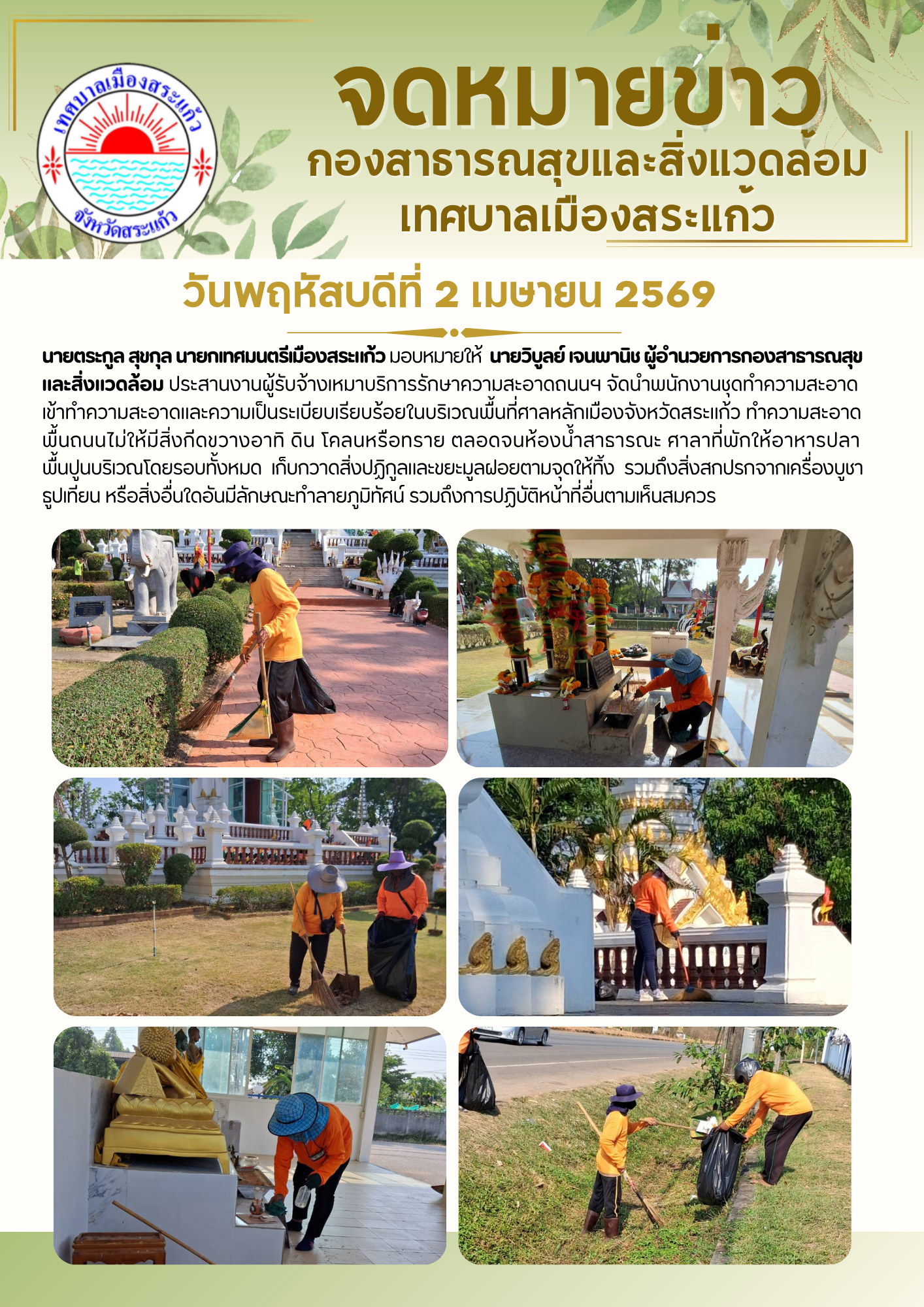 (2 เม.ย. 69) นายตระกูล สุขกุล นายกเทศมนตรีเมืองสระแก้ว มอบหมายให้นายวิบูลย์ เจนพานิช ผู้อำนวยการกองสาธารณสุขและสิ่งแวดล้อม ประสานงานผู้รับจ้างเหมาบริการรักษาความสะอาดถนนฯ จัดนำพนักงานชุดทำความสะอาด เข้าทำความสะอาดและความเป็นระเบียบเรียบร้อยในบริเวณพื้นที่ศาลหลักเมืองจังหวัดสระแก้ว ทำความสะอาดพื้นถนนไม่ให้มีสิ่งกีดขวางอาทิ ดิน โคลนหรือทราย ตลอดจนห้องน้ำสาธารณะ ศาลาที่พักให้อาหารปลาพื้นปูนบริเวณโดยรอบทั้งหมด เก็บกวาดสิ่งปฏิกูลและขยะมูลฝอยตามจุดให้ทิ้ง รวมถึงสิ่งสกปรกจากเครื่องบูชาธูปเทียนหรือสิ่งอื่นใดอันมีลักษณะทำลายภูมิทัศน์ รวมถึงการปฏิบัติหน้าที่อื่นตามเห็นสมควร