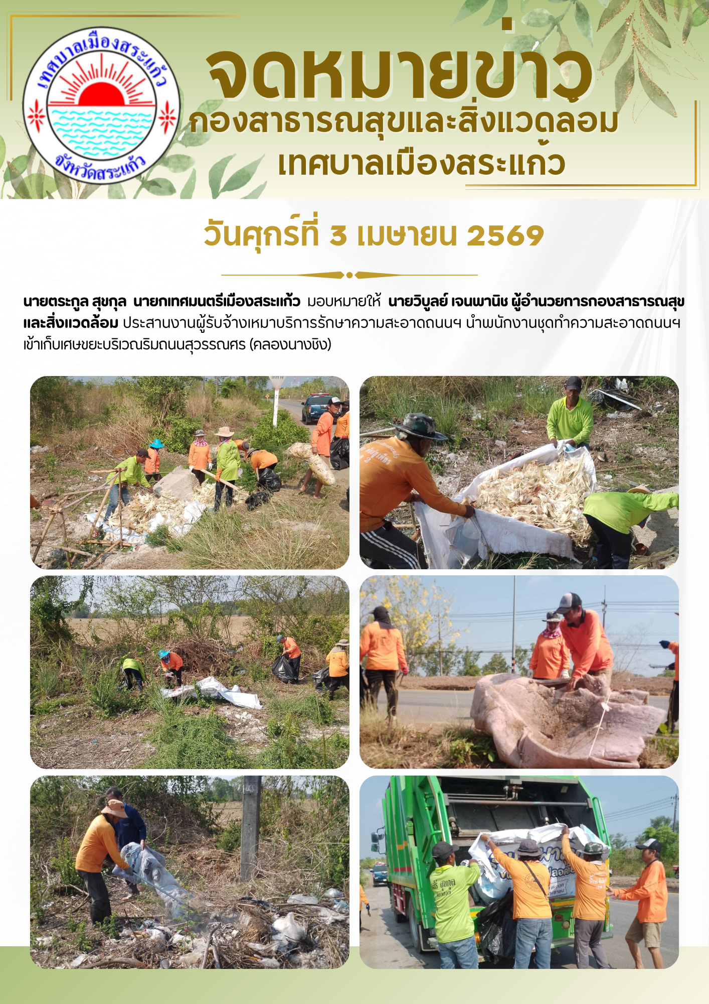 (3 เม.ย. 69) นายตระกูล สุขกุล นายกเทศมนตรีเมืองสระแก้ว มอบหมายให้นายวิบูลย์ เจนพานิช ผู้อำนวยการกองสาธารณสุขและสิ่งแวดล้อม ประสานงานผู้รับจ้างเหมาบริการรักษาความสะอาดถนนฯ นำพนักงานชุดทำความสะอาดฯ เข้าเก็บเศษขยะบริเวณริมถนนสุวรรณศร (คลองนางชิง)