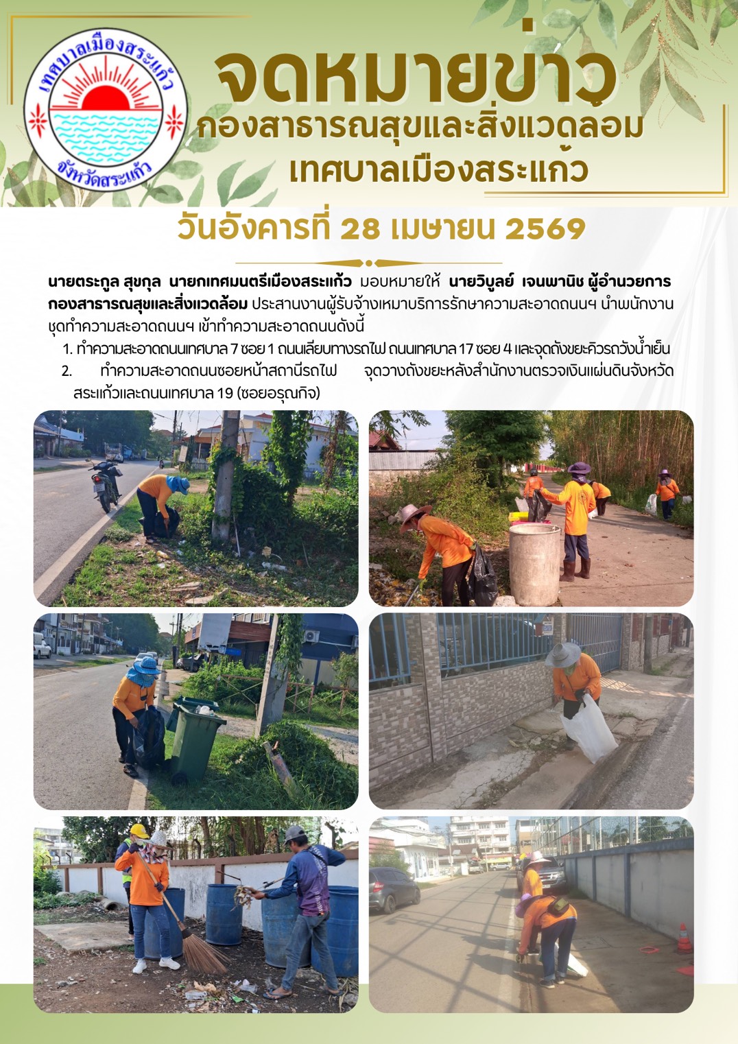 (28 เม.ย. 69) นายตระกูล สุขกุล นายกเทศมนตรีเมืองสระแก้ว มอบหมายให้นายวิบูลย์ เจนพานิช ผู้อำนวยการกองสาธารณสุขและสิ่งแวดล้อม ประสานงานผู้รับจ้างเหมาบริการรักษาความสะอาดถนนฯ นำพนักงานชุดทำความสะอาดถนนฯ เข้าทำความสะอาดถนนดังนี้