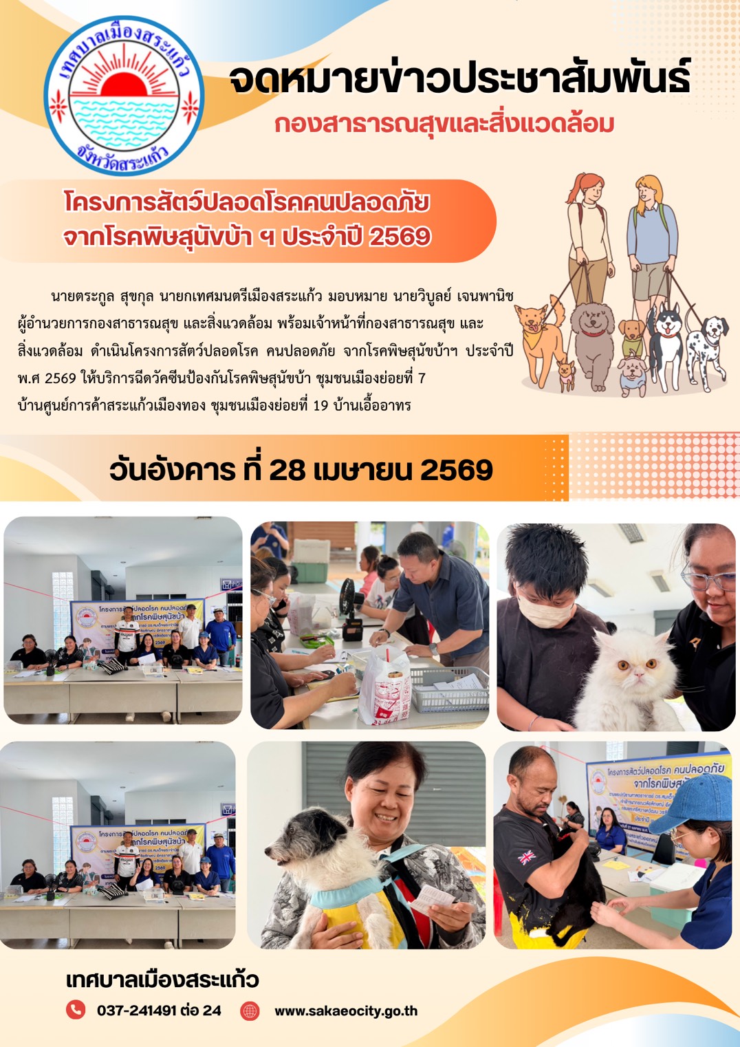 (28 เม.ย. 69) นายตระกูล สุขกุล นายกเทศมนตรีเมืองสระแก้ว มอบหมาย นายวิบูลย์ เจนพานิช ผู้อำนวยการกองสาธารณสุขและสิ่งแวดล้อม พร้อมเจ้าหน้าที่กองสาธารณสุขและสิ่งแวดล้อม ดำเนินโครงการสัตว์ปลอดโรค คนปลอดภัย จากโรคพิษสุนัขบ้าฯ ประจำปี พ.ศ 2569 ให้บริการฉีดวัคซีนป้องกันโรคพิษสุนัขบ้า ชุมชนเมืองย่อยที่ 7 (บ้านศูนย์การค้าสระแก้วเมืองทอง) และชุมชนเมืองย่อยที่ 19 (บ้านเอื้ออาทร)