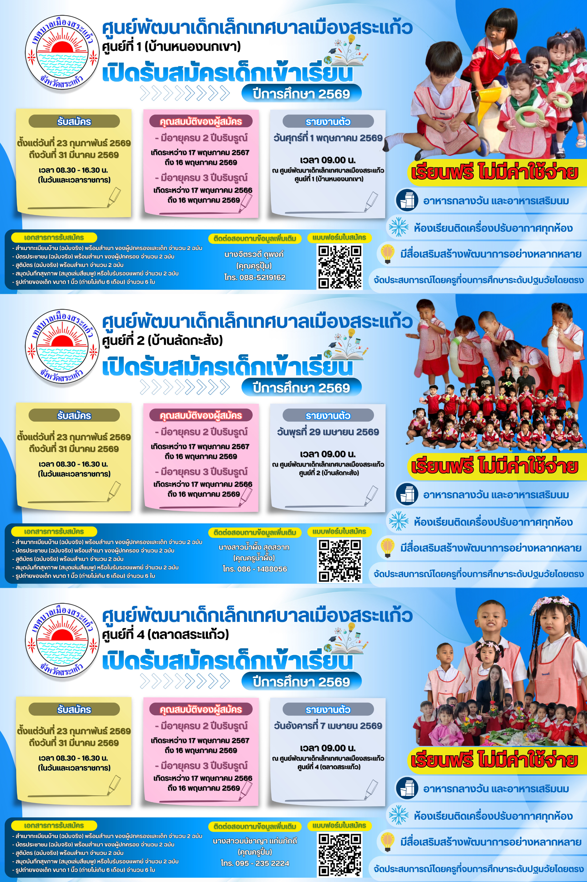 ประกาศเทศบาลเมืองสระแก้ว ศูนย์พัฒนาเด็กเล็กเทศบาลเมืองสระแก้ว เปิดรับสมัครเด็กเข้าเรียน ปีการศึกษา 2569